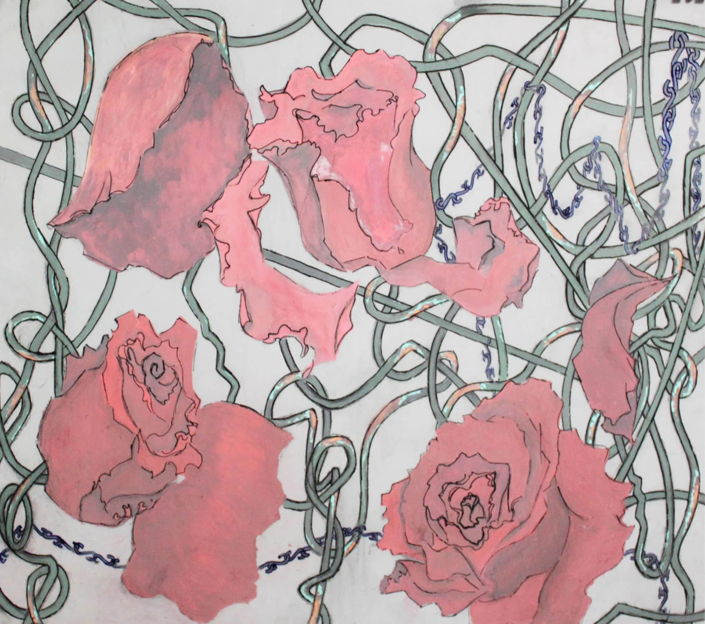 A representative portraiture of relationships. Roses symbolize individuals: getting to know them peels back their layers, in which they might seem to become “less beautiful” and the inner layers increasingly difficult to pluck off. The vines are a reiterated motif to symbolize the connections that relationships form; messy, entangled and unpredictable. They have the potential to become rusted and brittle when neglected. The chains symbolize the hardships in our relationships, oftentimes external factors out of our control: life, stress, depression, and responsibilities. These are all the worldly burdens that our vines must bear or succumb to.